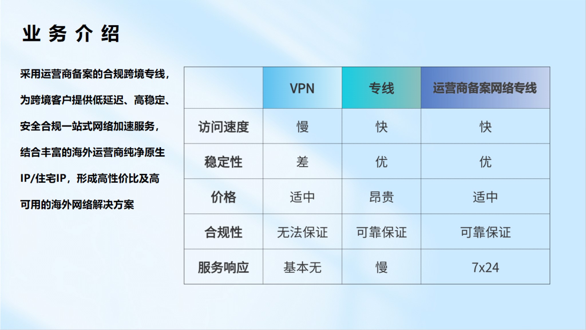 遵從運營商規(guī)則,采用運營商備案網絡專線,結合海外運營商純凈獨享原生IP,提供低延遲、高穩(wěn)定、安全合規(guī)的海外網絡服務